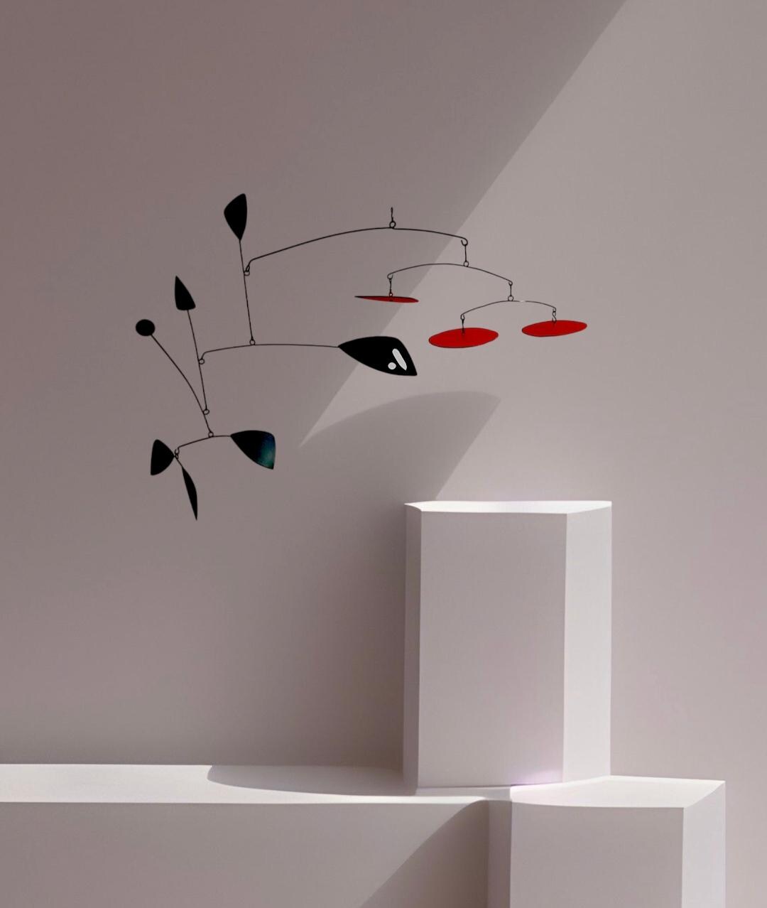 The "Kyoto Minimal" kinetic sculpture is a hanging mobile with a contemporary minimalist design in black and red. This mobile is entirely hand-cut, assembled, and painted using various materials: aluminum foil, wire, hooks, and matte paint. The mobile comes with 1.2m of nylon thread and a hook for hanging.
