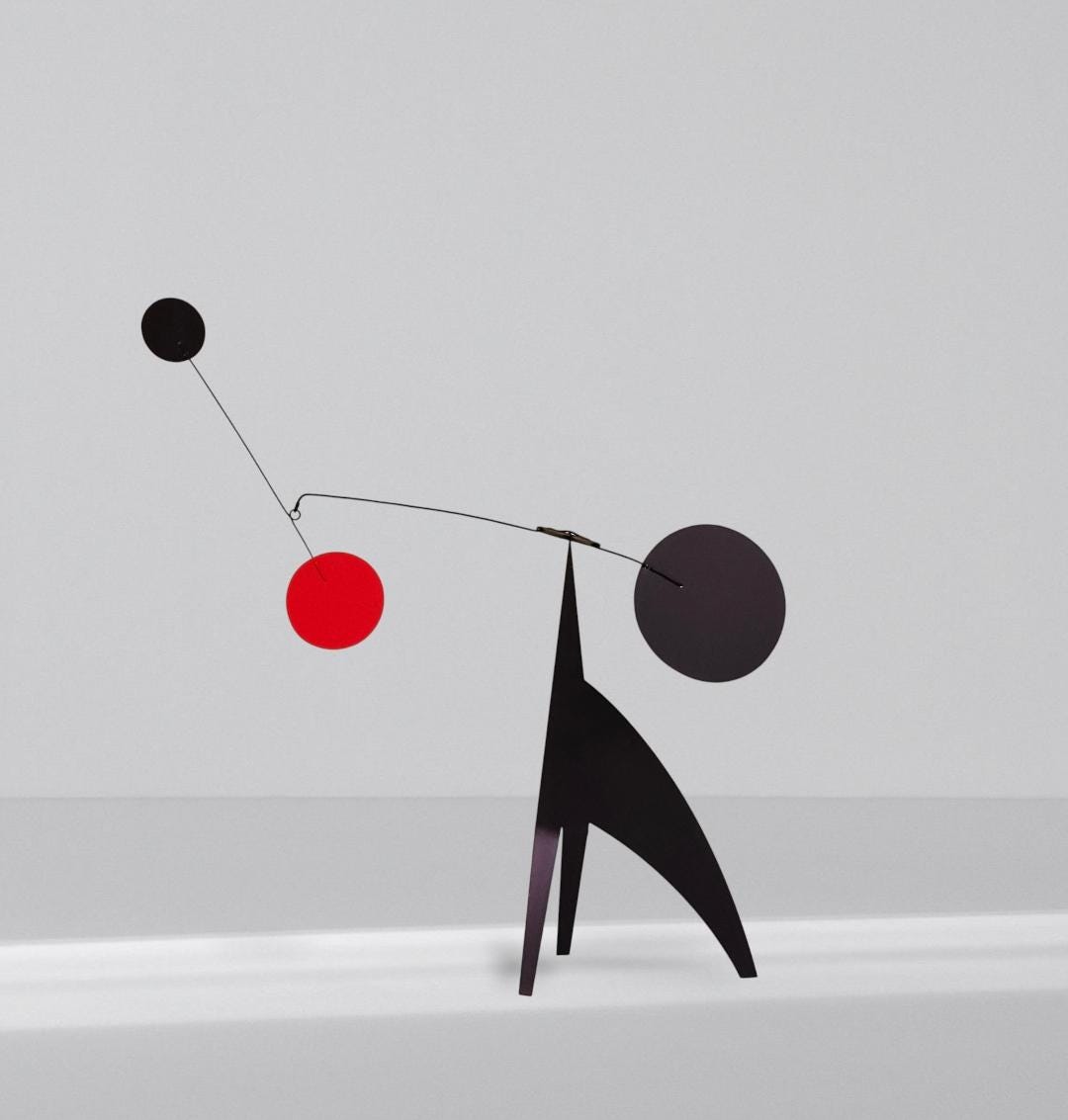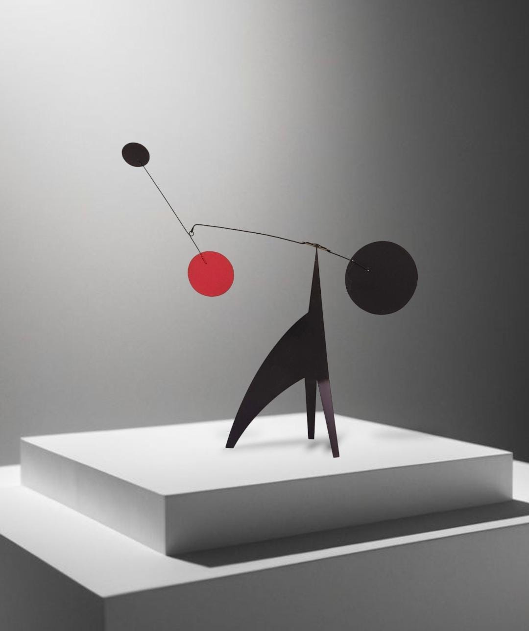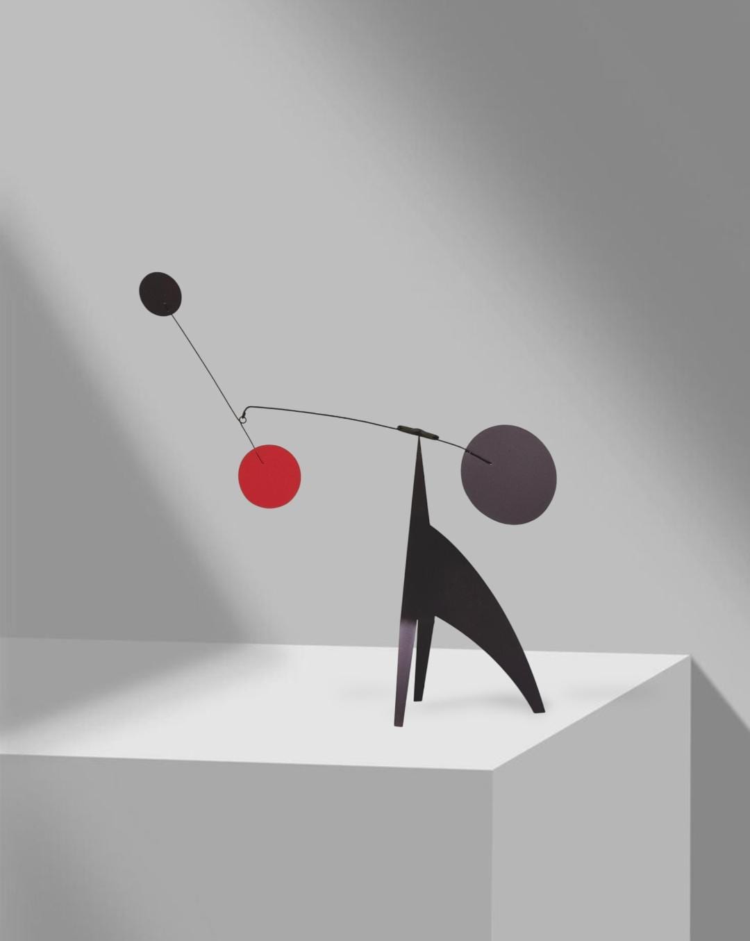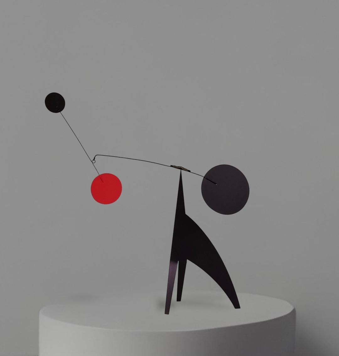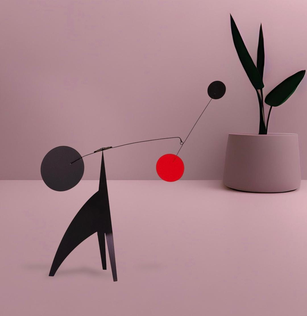 The "Red Seagull" mobile sculpture is a decorative, minimalist, contemporary stabile inspired by Calder's work in the spirit of the 1940s/70s. This stabile is entirely assembled and hand-painted using various materials: sheet steel, iron rod, hook, and matte paint. It will find its place naturally on a shelf, console, or coffee table and will come to life with the slightest breeze. Its stable design (1.5mm steel base) on a pivoting axis allows it to rotate 360°.