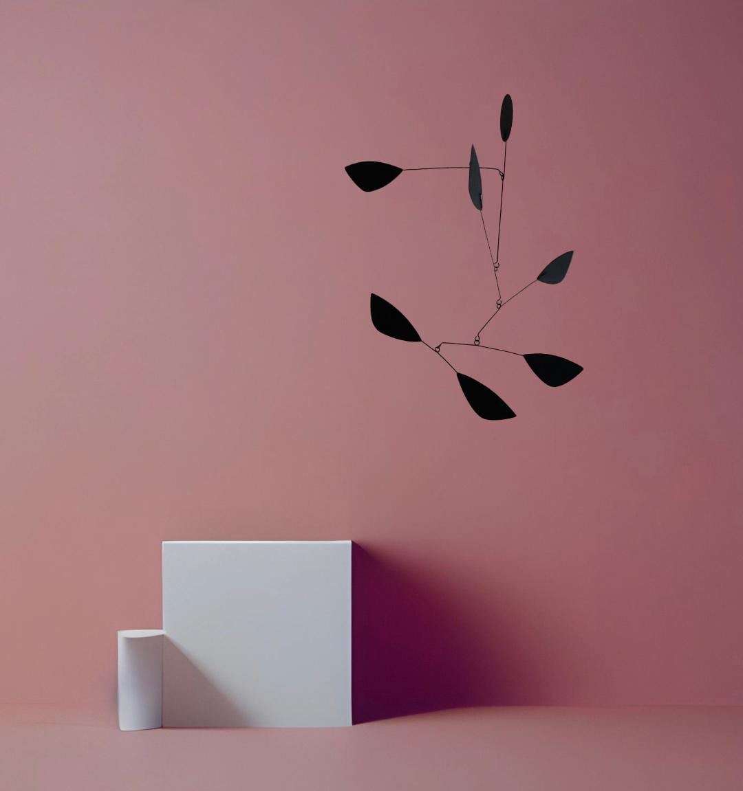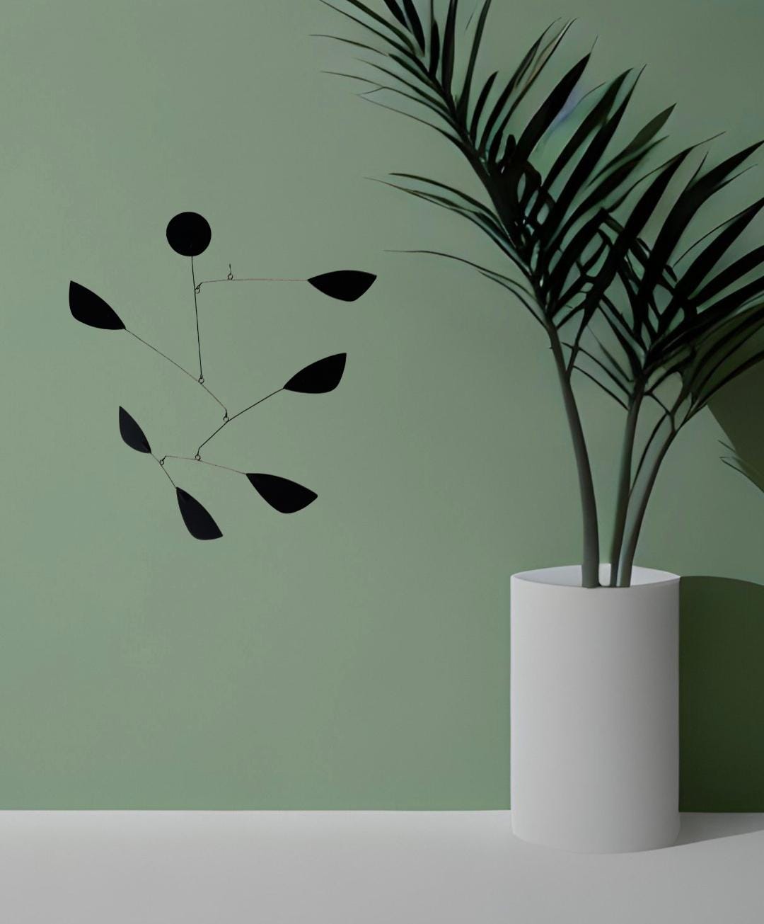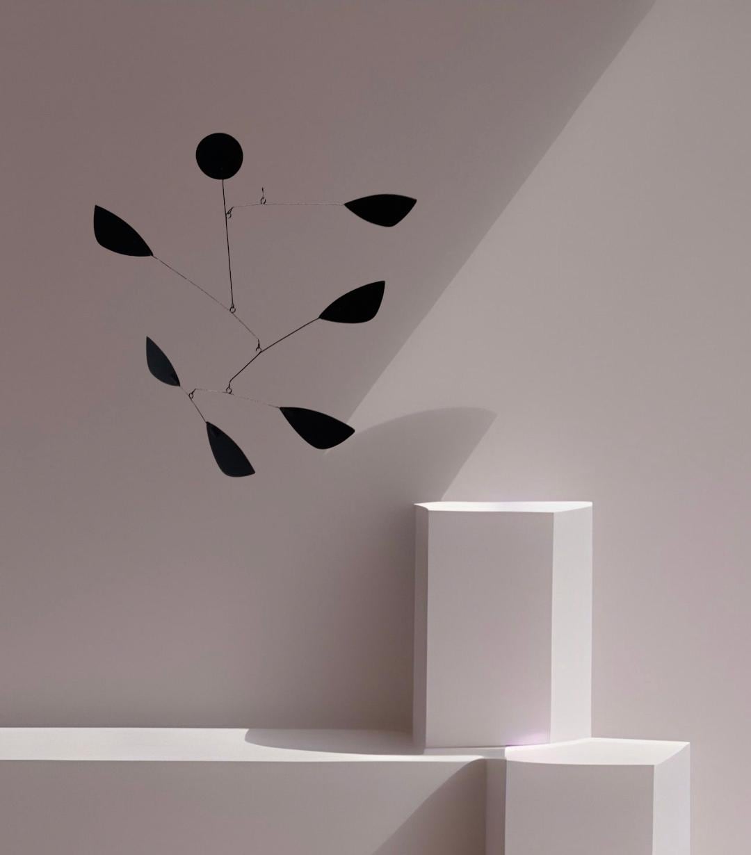 The "Black Toccata" kinetic sculpture is a hanging mobile with a minimalist contemporary design. This mobile is entirely hand-cut, assembled, and painted using various materials: aluminum and steel sheet, wire, a hook, and matte paint. The mobile comes with 1.2 meters of nylon thread and a hook for hanging.