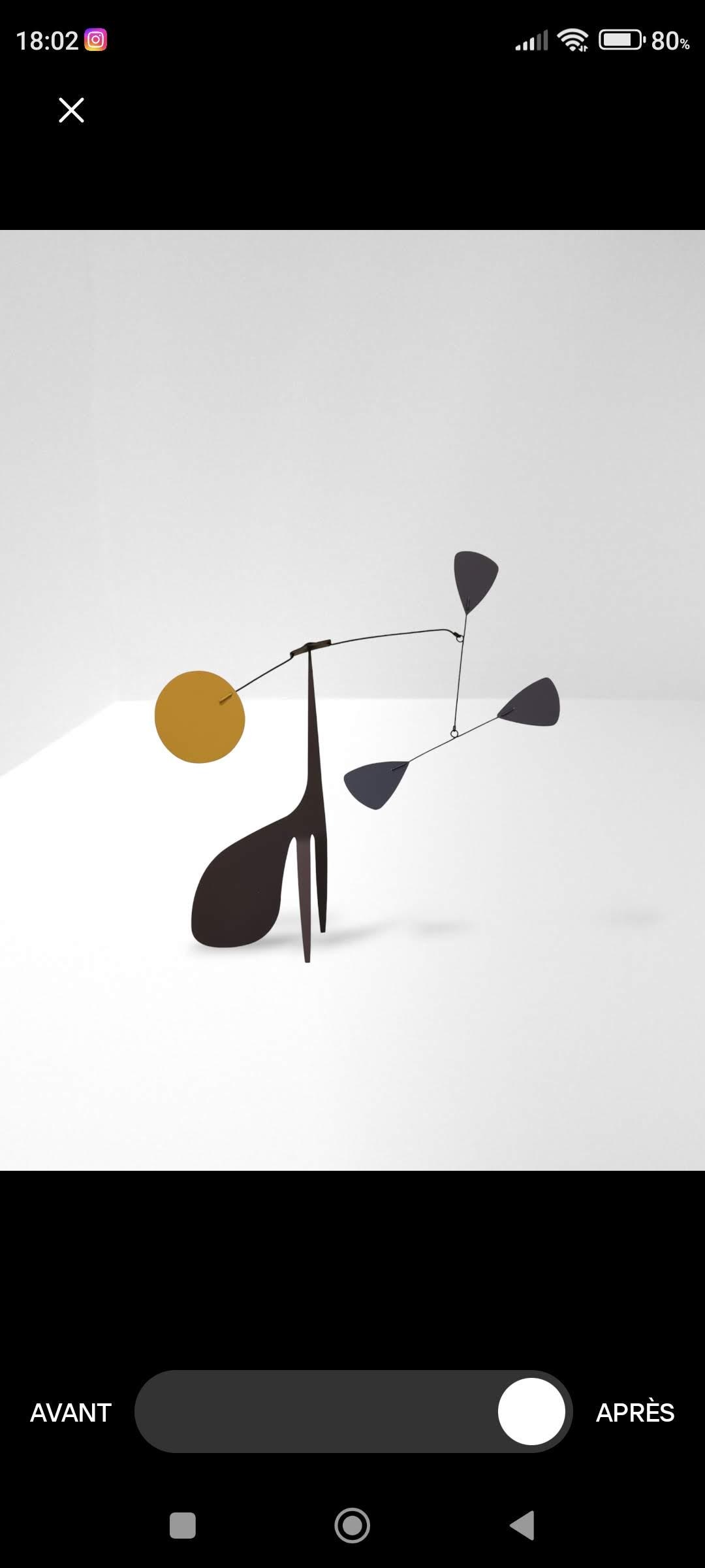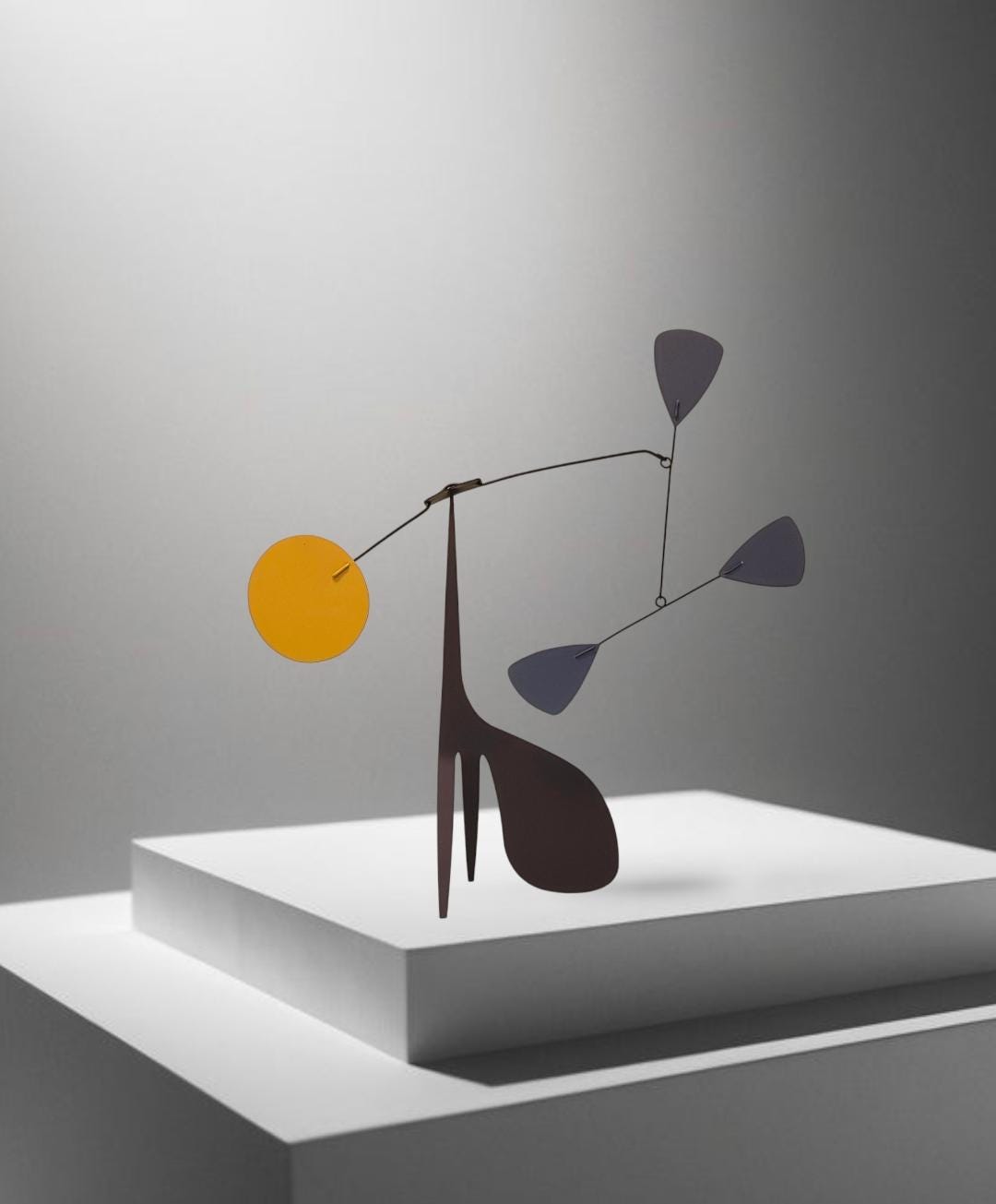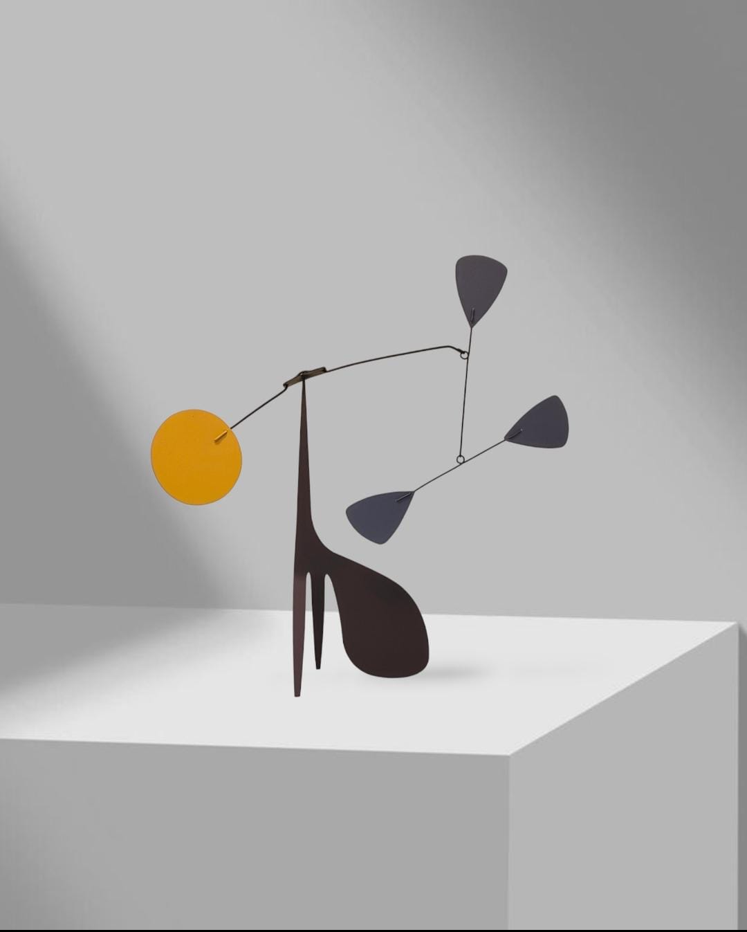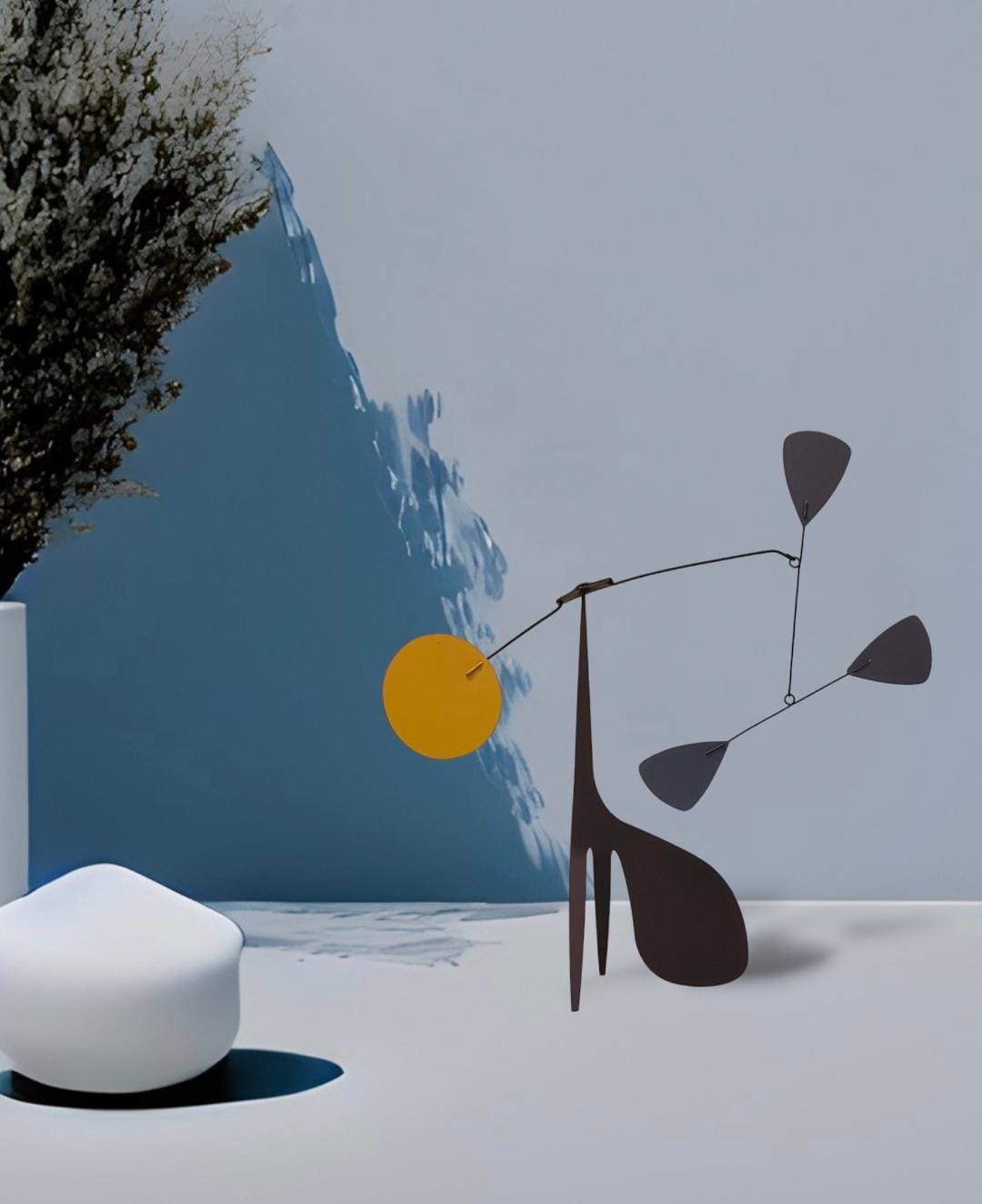 The "Iriko" mobile sculpture is a decorative, contemporary-style mobile inspired by Calder's work in the spirit of the 1940s/70s. This mobile is entirely assembled and hand-painted using various materials: steel and aluminum sheets, an iron rod, a hook, and matte paint. It will find its place naturally on a shelf, console, or coffee table and will come to life with the slightest breeze. Its stable design (1.5mm steel base) on a pivoting axis allows it to rotate 360°.
